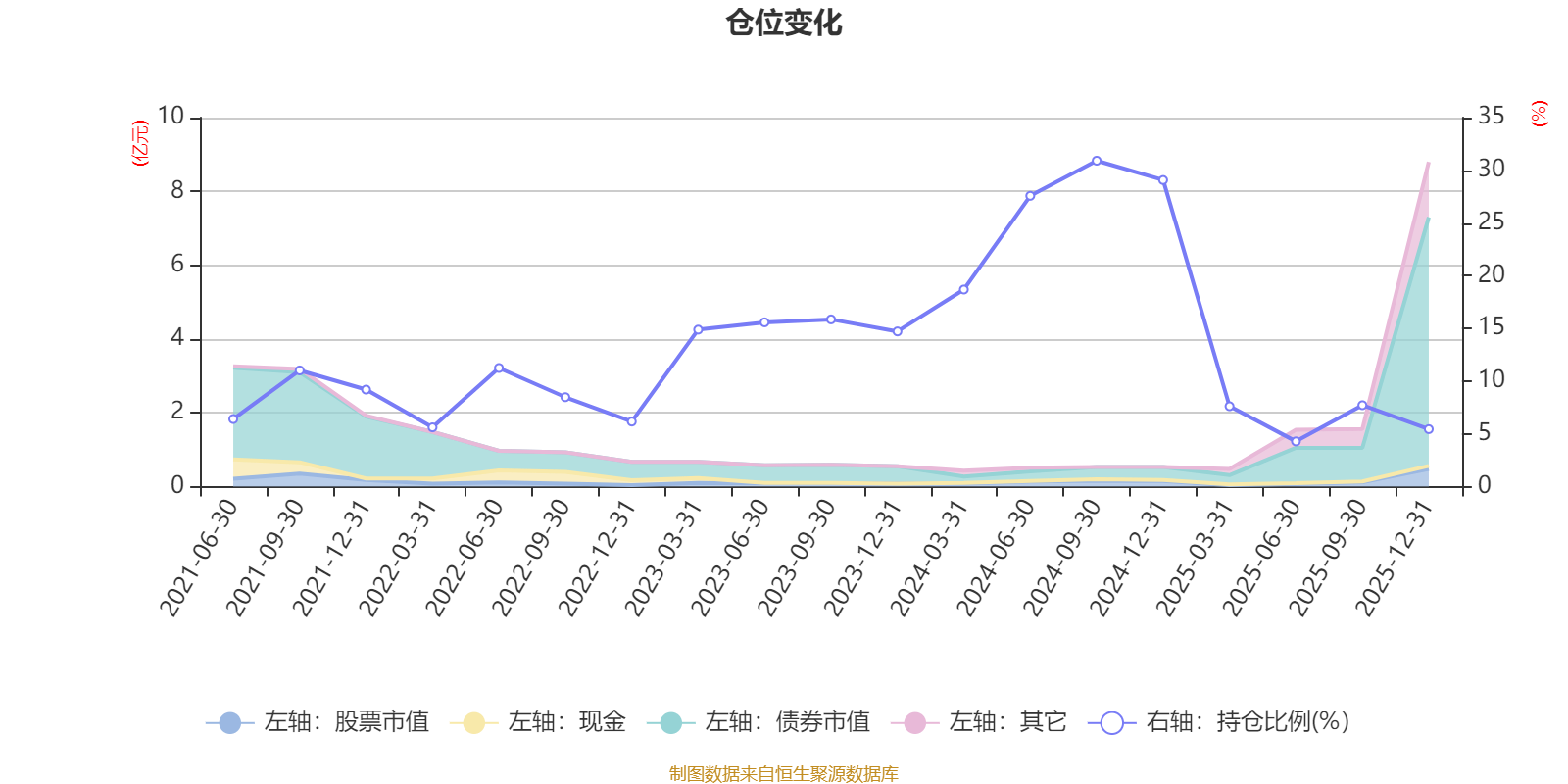 据定期报告数据统计,近三年平均股票仓位为16.03%,同类平均为19.2%。2024年三季度末基金达到30.91%的最高仓位,2025年上半年末最低,为4.29%。