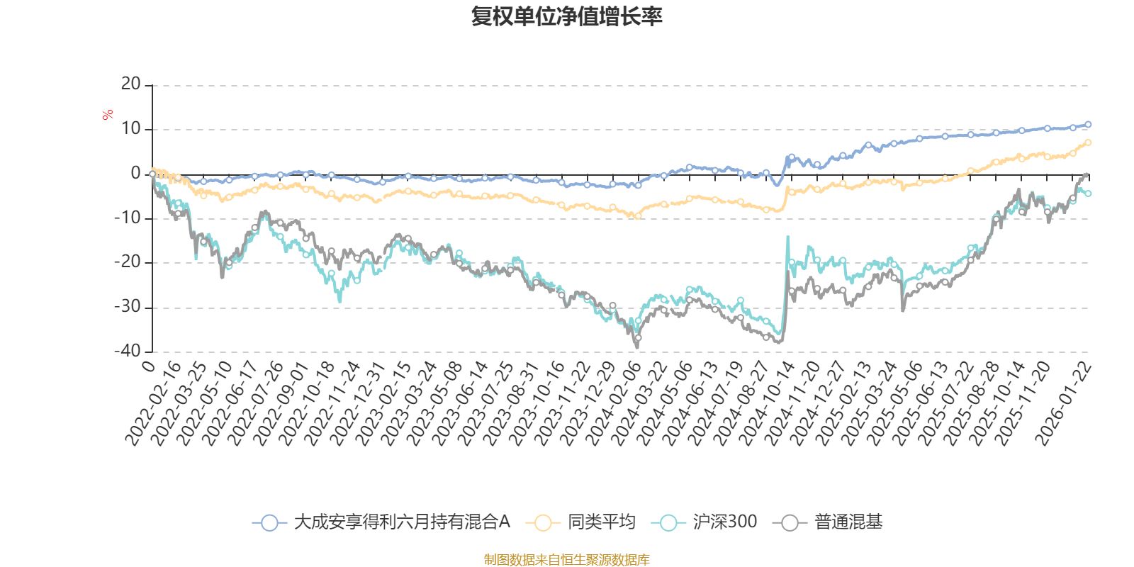 截至1月22日,大成安享得利六月持有混合A近三个月复权单位净值增长率为1.31%,位于同类可比基金449/629;近半年复权单位净值增长率为2.12%,位于同类可比基金509/629;近一年复权单位净值增长率为5.95%,位于同类可比基金423/626;近三年复权单位净值增长率为12.16%,位于同类可比基金264/564。