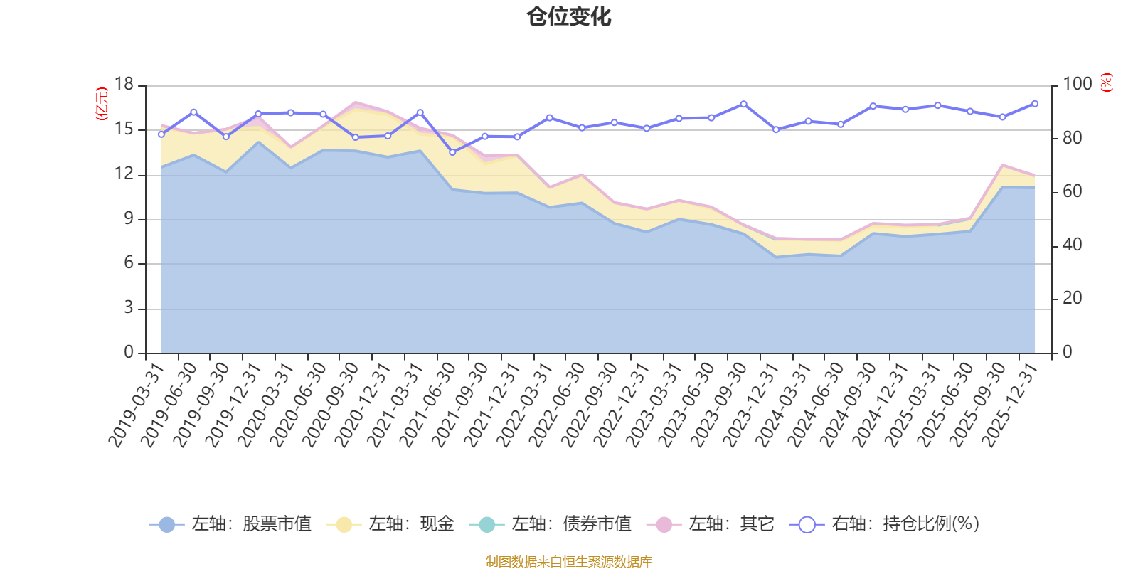 据定期报告数据统计,近三年平均股票仓位为89.3%,同类平均为86.12%。2025年末基金达到93.17%的最高仓位,2021年上半年末最低,为75.02%。