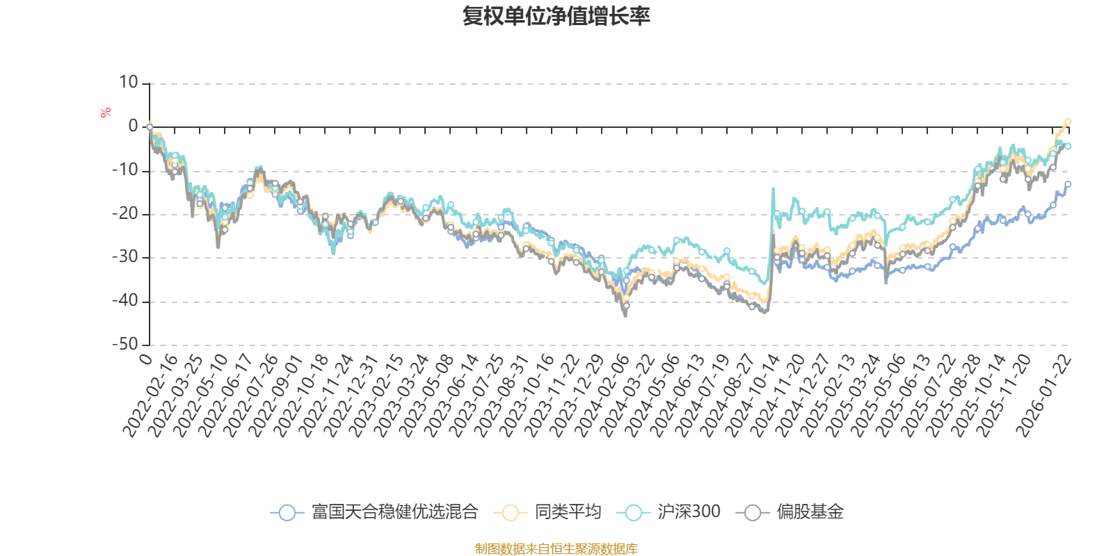 截至1月22日,富国天合稳健优选混合近三个月复权单位净值增长率为11.43%,位于同类可比基金46/130;近半年复权单位净值增长率为19.76%,位于同类可比基金79/130;近一年复权单位净值增长率为31.91%,位于同类可比基金78/130;近三年复权单位净值增长率为4.45%,位于同类可比基金90/125。