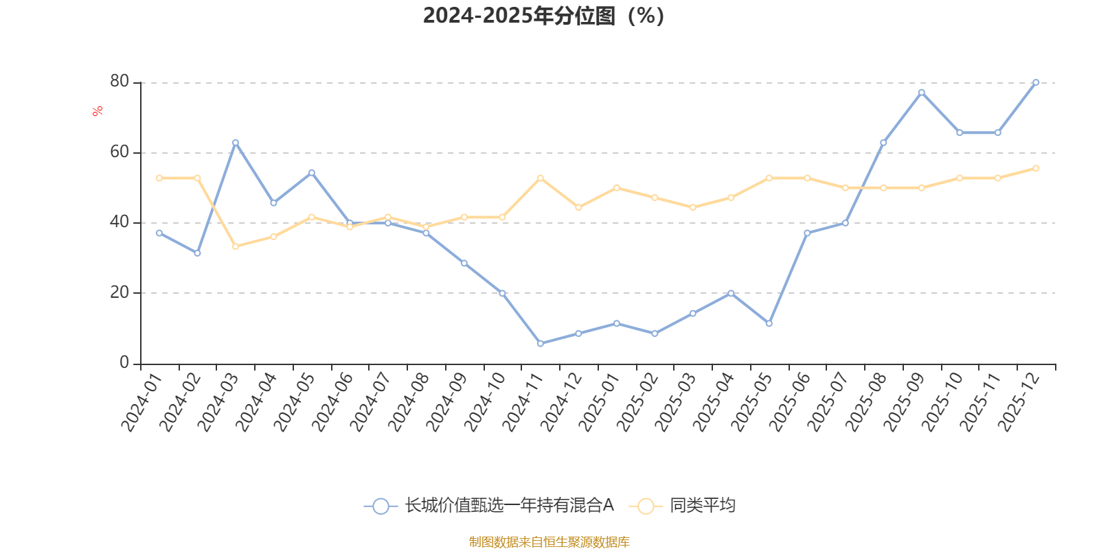 通过所选区间该基金净值增长率分位图,可以观察该基金与同类基金业绩比较情况。图为坐标原点到区间内某时点的净值增长率在同类基金中的分位数。