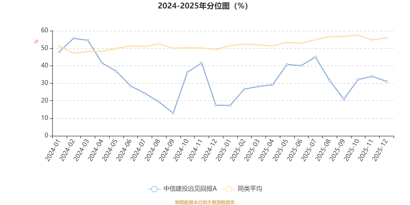 通过所选区间该基金净值增长率分位图,可以观察该基金与同类基金业绩比较情况。图为坐标原点到区间内某时点的净值增长率在同类基金中的分位数。