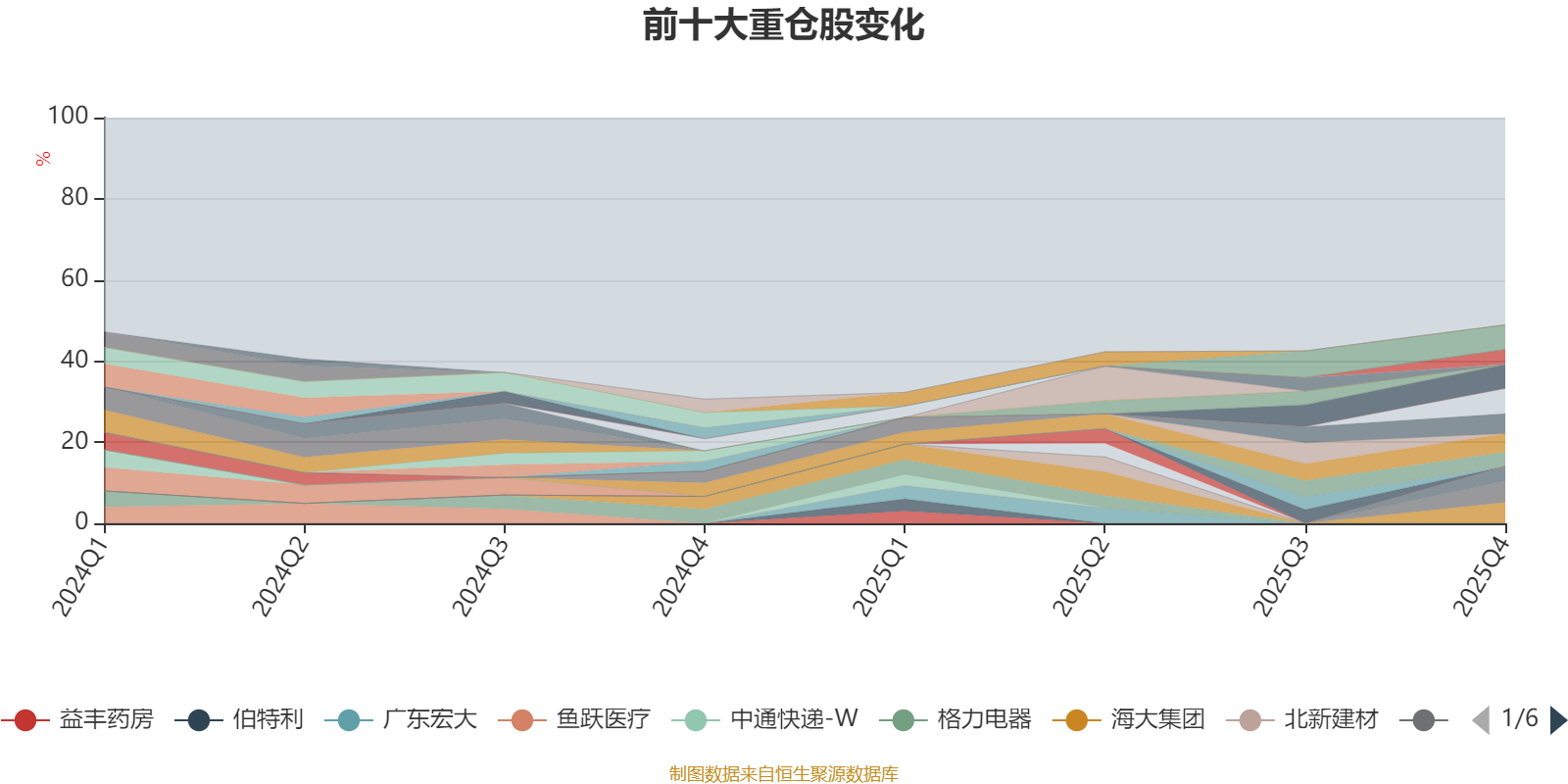 截至2025年四季度末,基金十大重仓股分别是伊利股份、华润置地、赛轮轮胎、宁波银行、海大集团、徐工机械、新洋丰、腾讯控股、豪迈科技、东方雨虹。