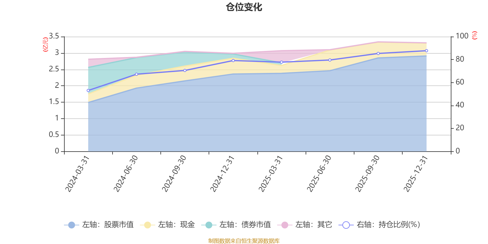 据定期报告数据统计,成立以来平均股票仓位为75.06%,同类平均为85.83%。2025年末基金达到87.74%的最高仓位,2024年一季度末最低,为53.1%。