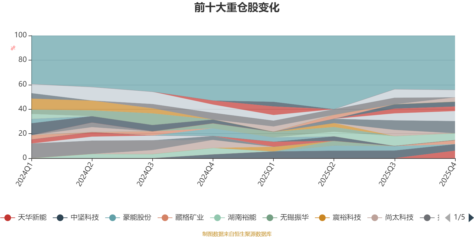 截至2025年四季度末,基金十大重仓股分别是东山精密、中际旭创、天华新能、宁德时代、新易盛、中坚科技、三花智控、华友钴业、浙江荣泰、藏格矿业。