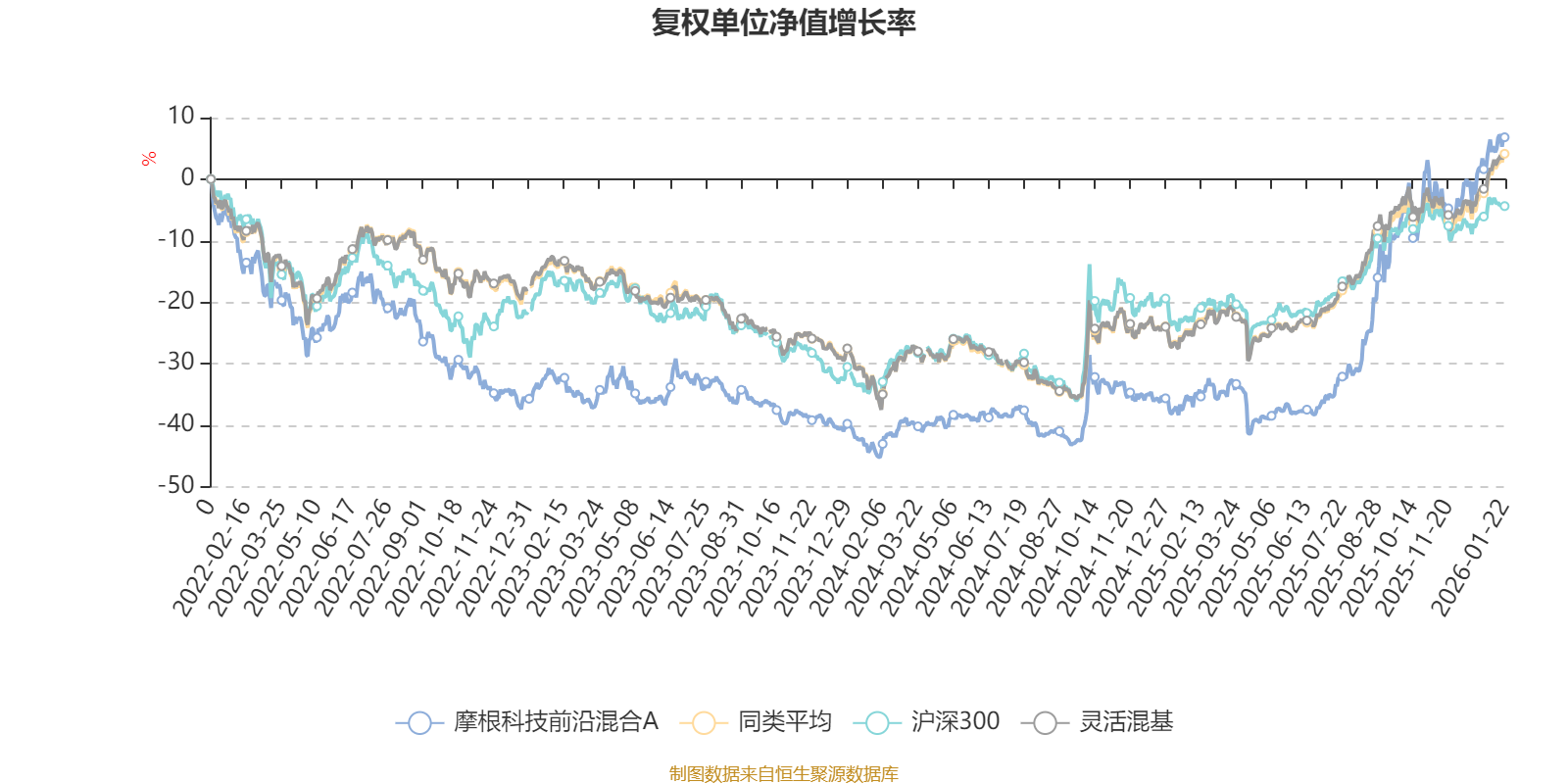 截至1月22日,摩根科技前沿混合A近三个月复权单位净值增长率为12.93%,位于同类可比基金398/1286;近半年复权单位净值增长率为57.35%,位于同类可比基金103/1286;近一年复权单位净值增长率为65.30%,位于同类可比基金165/1286;近三年复权单位净值增长率为56.58%,位于同类可比基金144/1286。