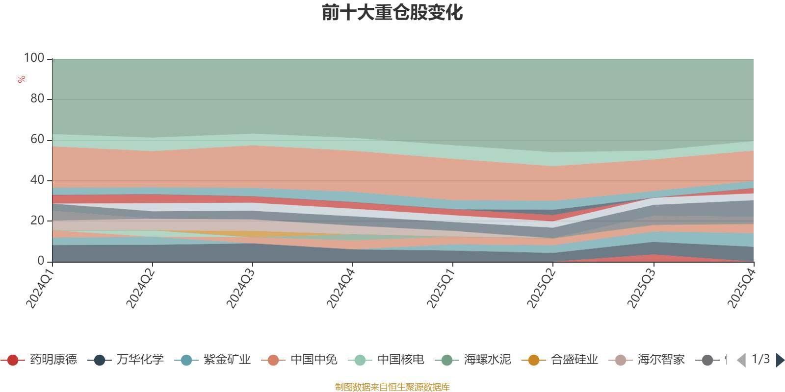 该基金持股集中度较高,且持股标的较为稳定。截至2025年四季度末,基金十大重仓股分别是贵州茅台、中国平安、万华化学、紫金矿业、招商银行、中国中免、伊利股份、恒瑞医药、三一重工、长江电力。