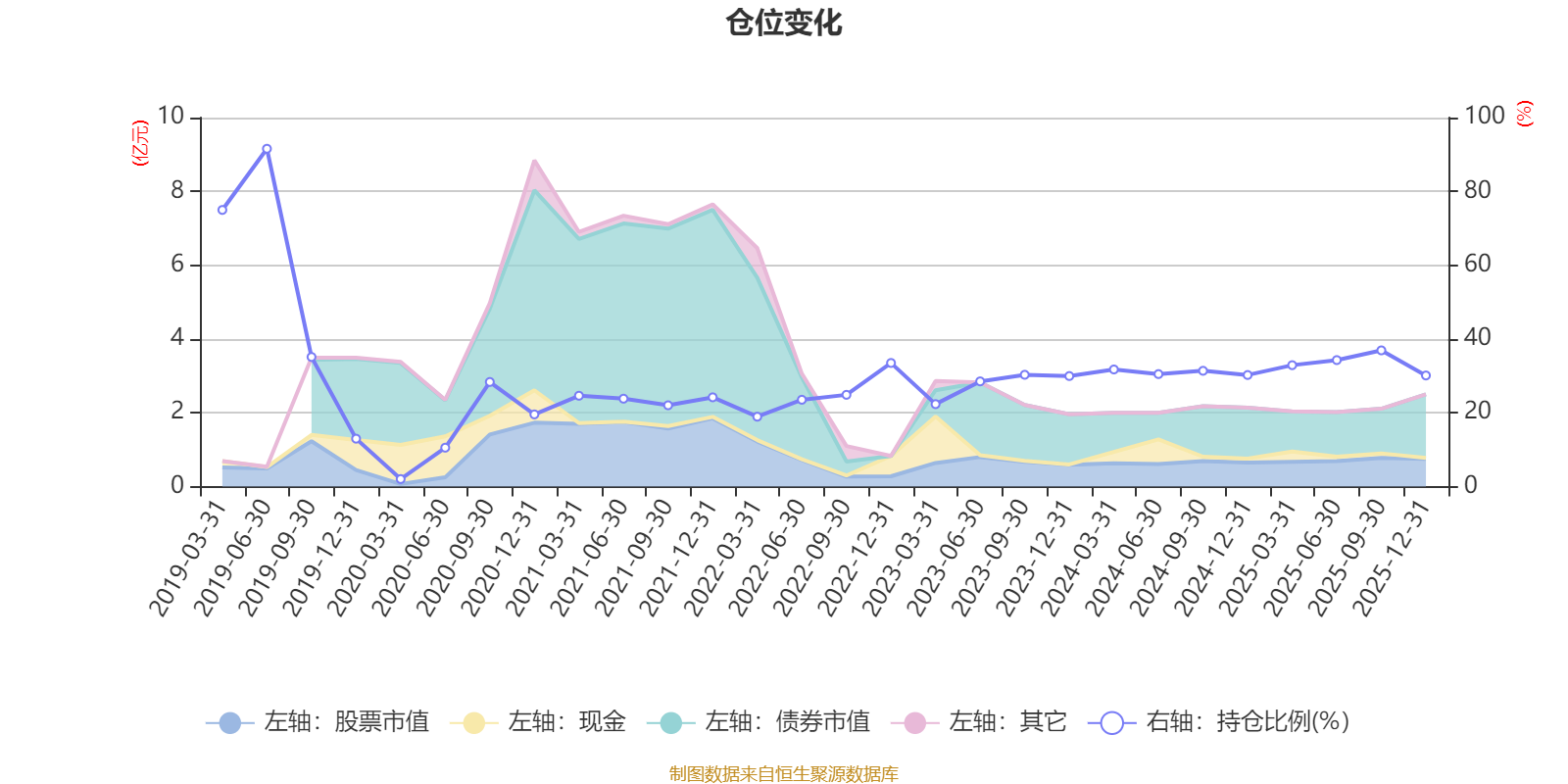 据定期报告数据统计,近三年平均股票仓位为30.76%,同类平均为72.57%。2019年上半年末基金达到91.56%的最高仓位,2020年一季度末最低,为2.04%。