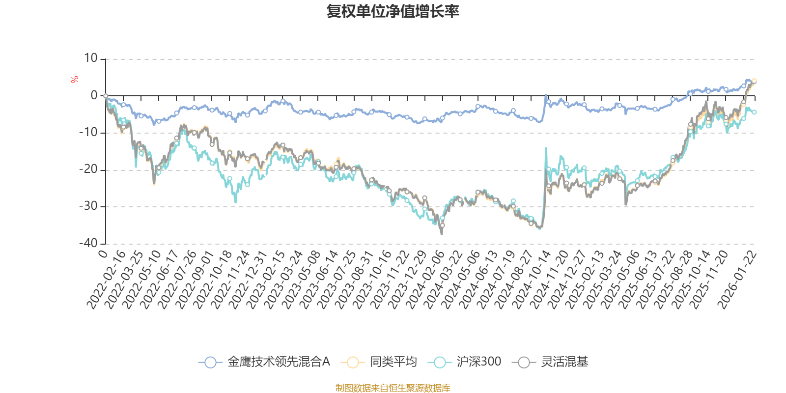 截至1月22日,金鹰技术领先混合A近三个月复权单位净值增长率为2.56%,位于同类可比基金1004/1286;近半年复权单位净值增长率为4.78%,位于同类可比基金1076/1286;近一年复权单位净值增长率为8.34%,位于同类可比基金1121/1286;近三年复权单位净值增长率为5.25%,位于同类可比基金914/1286。