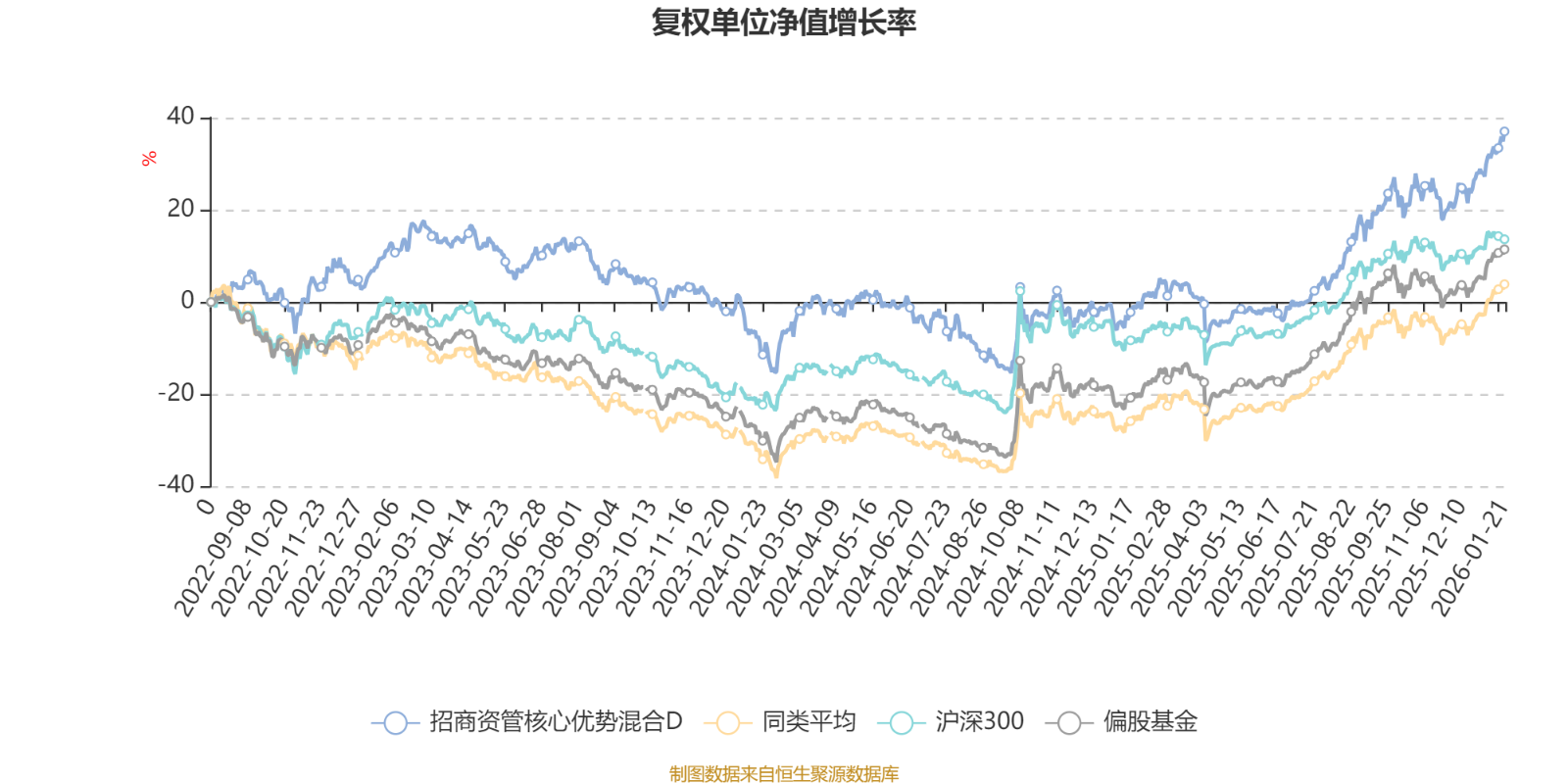 截至1月21日,招商资管核心优势混合D近三个月复权单位净值增长率为12.81%,位于同类可比基金207/689;近半年复权单位净值增长率为33.74%,位于同类可比基金203/689;近一年复权单位净值增长率为38.17%,位于同类可比基金325/673;近三年复权单位净值增长率为23.27%,位于同类可比基金150/396。