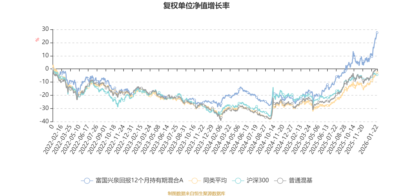 截至1月22日,富国兴泉回报12个月持有期混合A近三个月复权单位净值增长率为21.81%,位于同类可比基金10/134;近半年复权单位净值增长率为35.46%,位于同类可比基金21/134;近一年复权单位净值增长率为67.06%,位于同类可比基金9/131;近三年复权单位净值增长率为49.05%,位于同类可比基金12/124。