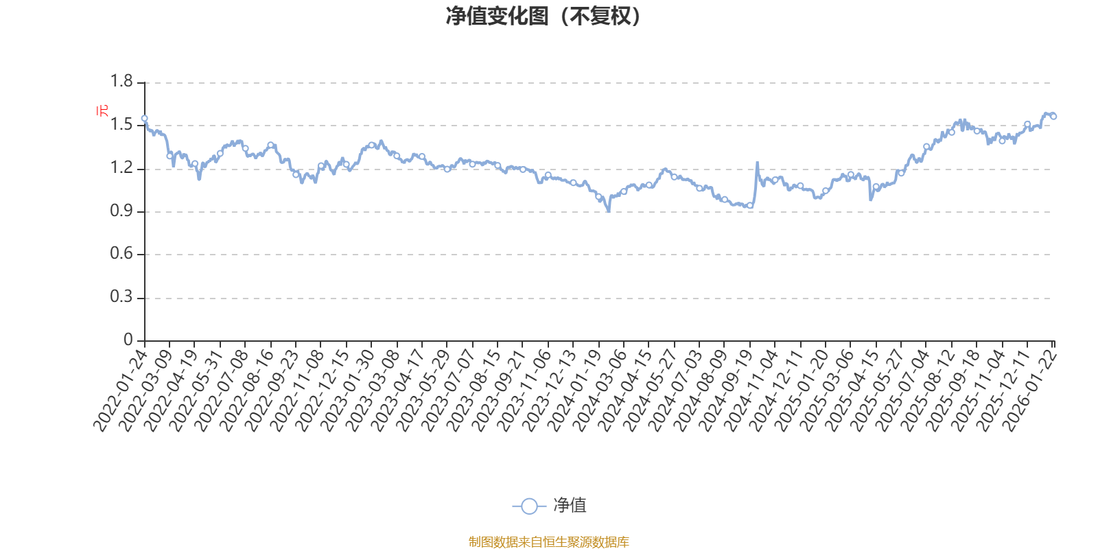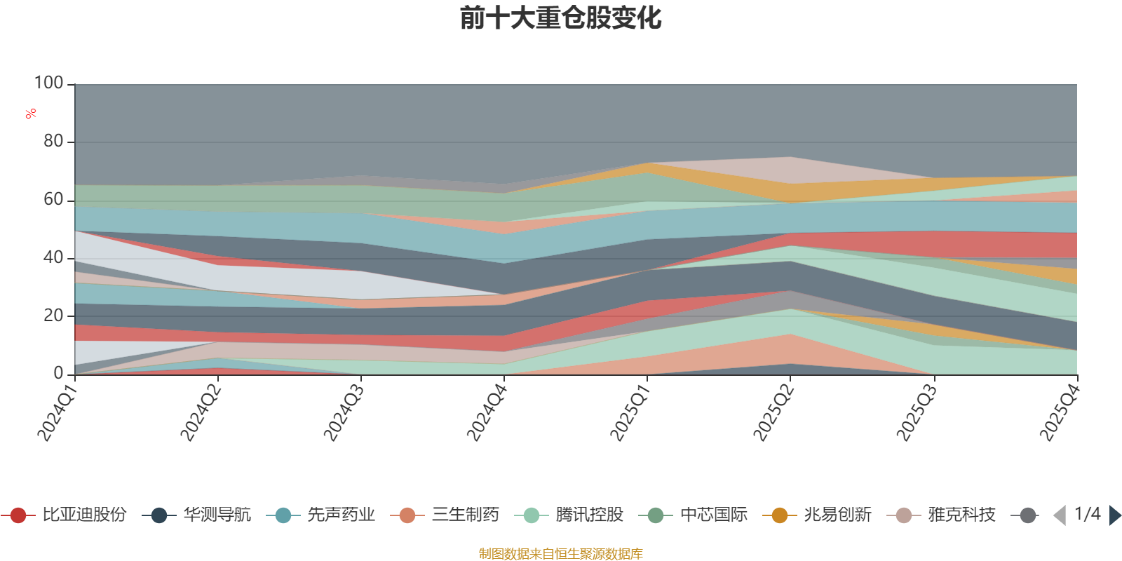 该基金持股集中度较高,近2年前十大重仓股集中度长期超过60%。截至2025年四季度末,基金十大重仓股分别是蓝晓科技、热景生物、春风动力、悦康药业、腾讯控股、东山精密、阿里巴巴-W、宁德时代、中际旭创、新易盛。