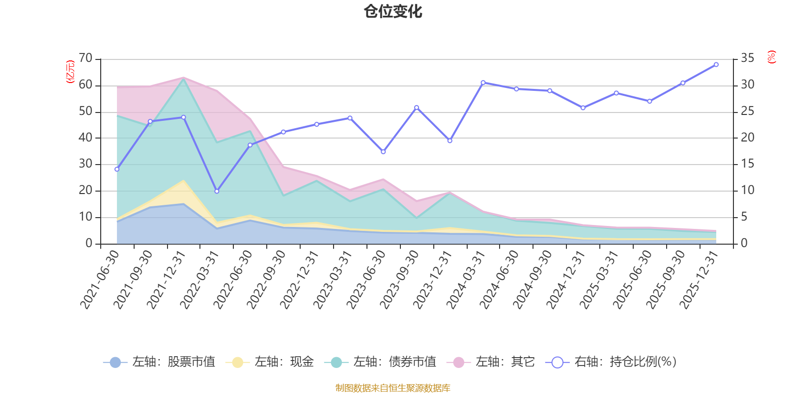 据定期报告数据统计,近三年平均股票仓位为26.76%,同类平均为19.2%。2025年末基金达到33.94%的最高仓位,2022年一季度末最低,为9.96%。