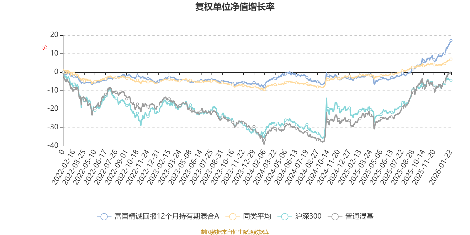 截至1月22日,富国精诚回报12个月持有期混合A近三个月复权单位净值增长率为10.79%,位于同类可比基金16/629;近半年复权单位净值增长率为17.76%,位于同类可比基金24/629;近一年复权单位净值增长率为20.94%,位于同类可比基金36/626;近三年复权单位净值增长率为21.61%,位于同类可比基金66/564。