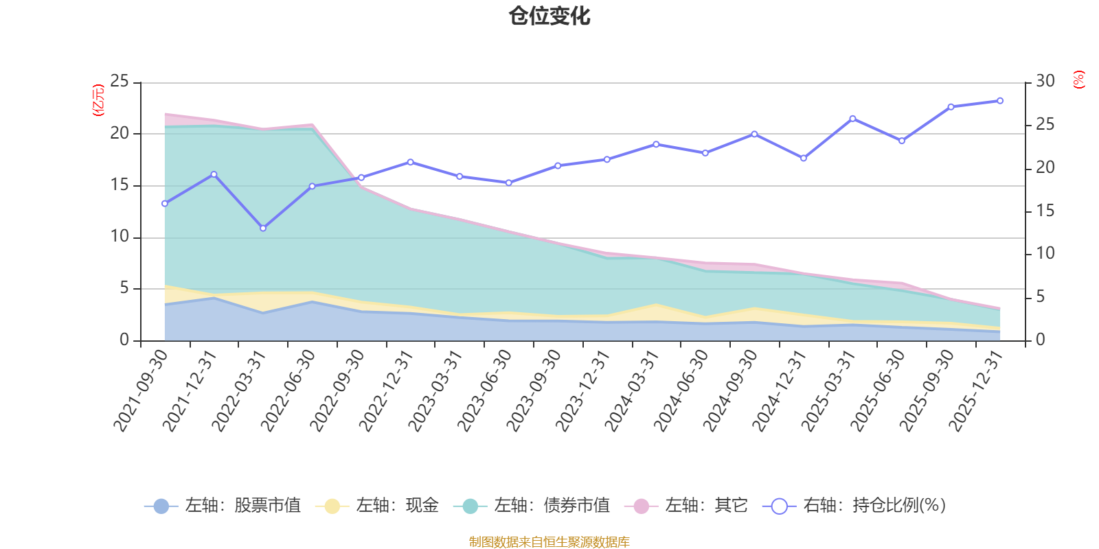 据定期报告数据统计,近三年平均股票仓位为22.72%,同类平均为19.2%。2025年末基金达到27.87%的最高仓位,2022年一季度末最低,为13.06%。