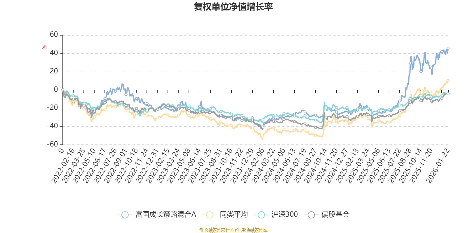 截至1月22日,富国成长策略混合A近三个月复权单位净值增长率为12.90%,位于同类可比基金138/229;近半年复权单位净值增长率为65.98%,位于同类可比基金66/229;近一年复权单位净值增长率为85.39%,位于同类可比基金40/222;近三年复权单位净值增长率为81.94%,位于同类可比基金44/165。