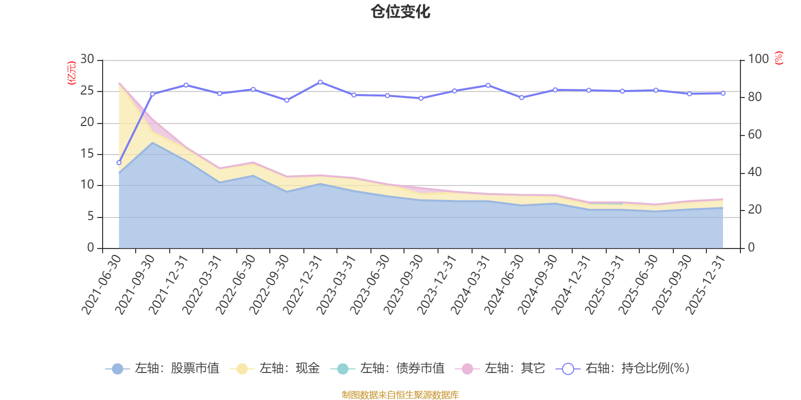 据定期报告数据统计,近三年平均股票仓位为82.68%,同类平均为86.12%。2022年末基金达到88.23%的最高仓位,2021年上半年末最低,为45.48%。