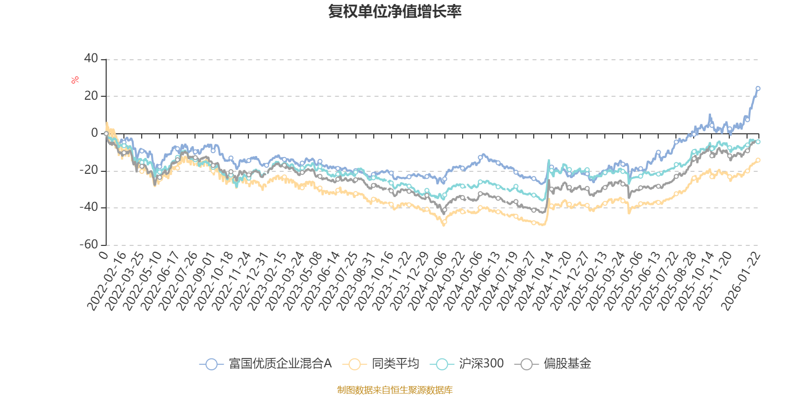 截至1月22日,富国优质企业混合A近三个月复权单位净值增长率为22.98%,位于同类可比基金22/621;近半年复权单位净值增长率为30.15%,位于同类可比基金216/621;近一年复权单位净值增长率为60.29%,位于同类可比基金111/613;近三年复权单位净值增长率为41.29%,位于同类可比基金95/535。