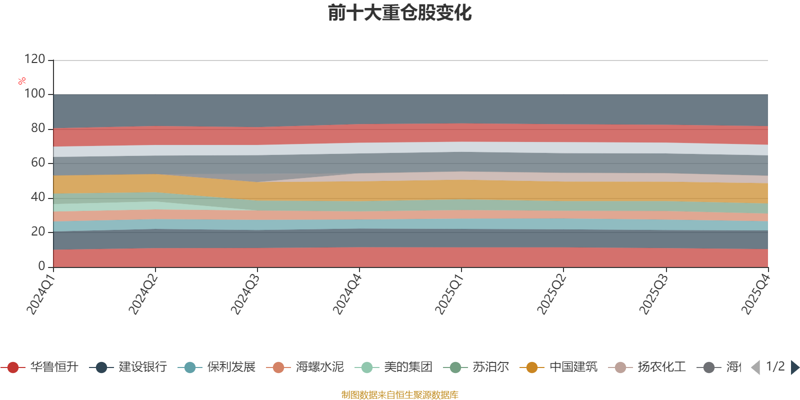 该基金持股集中度较高,且持股标的较为稳定,近2年前十大重仓股集中度长期超过60%。截至2025年四季度末,基金十大重仓股分别是太阳纸业、中国建筑、建设银行、工商银行、华鲁恒升、建发股份、苏泊尔、保利发展、海螺水泥、扬农化工。