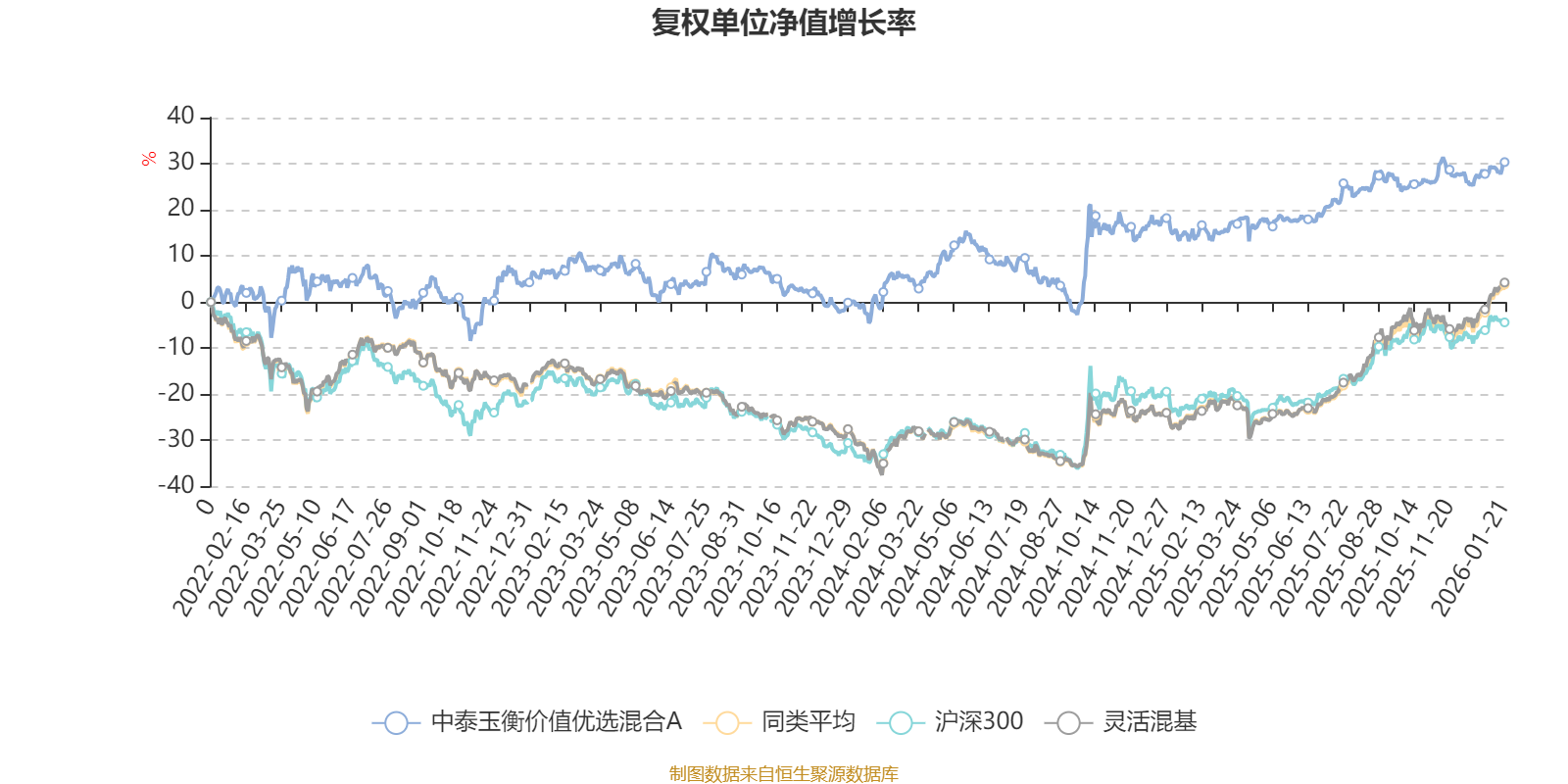 截至1月21日,中泰玉衡价值优选混合A近三个月复权单位净值增长率为3.64%,位于同类可比基金909/1286;近半年复权单位净值增长率为5.29%,位于同类可比基金1064/1286;近一年复权单位净值增长率为13.68%,位于同类可比基金1032/1286;近三年复权单位净值增长率为21.97%,位于同类可比基金515/1286。