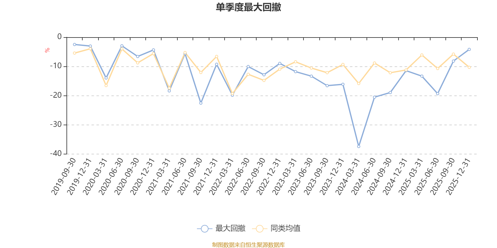 截至1月22日,基金近三年最大回撤为56.7%,同类可比基金排名368/378。单季度最大回撤出现在2024年一季度,为37.45%。