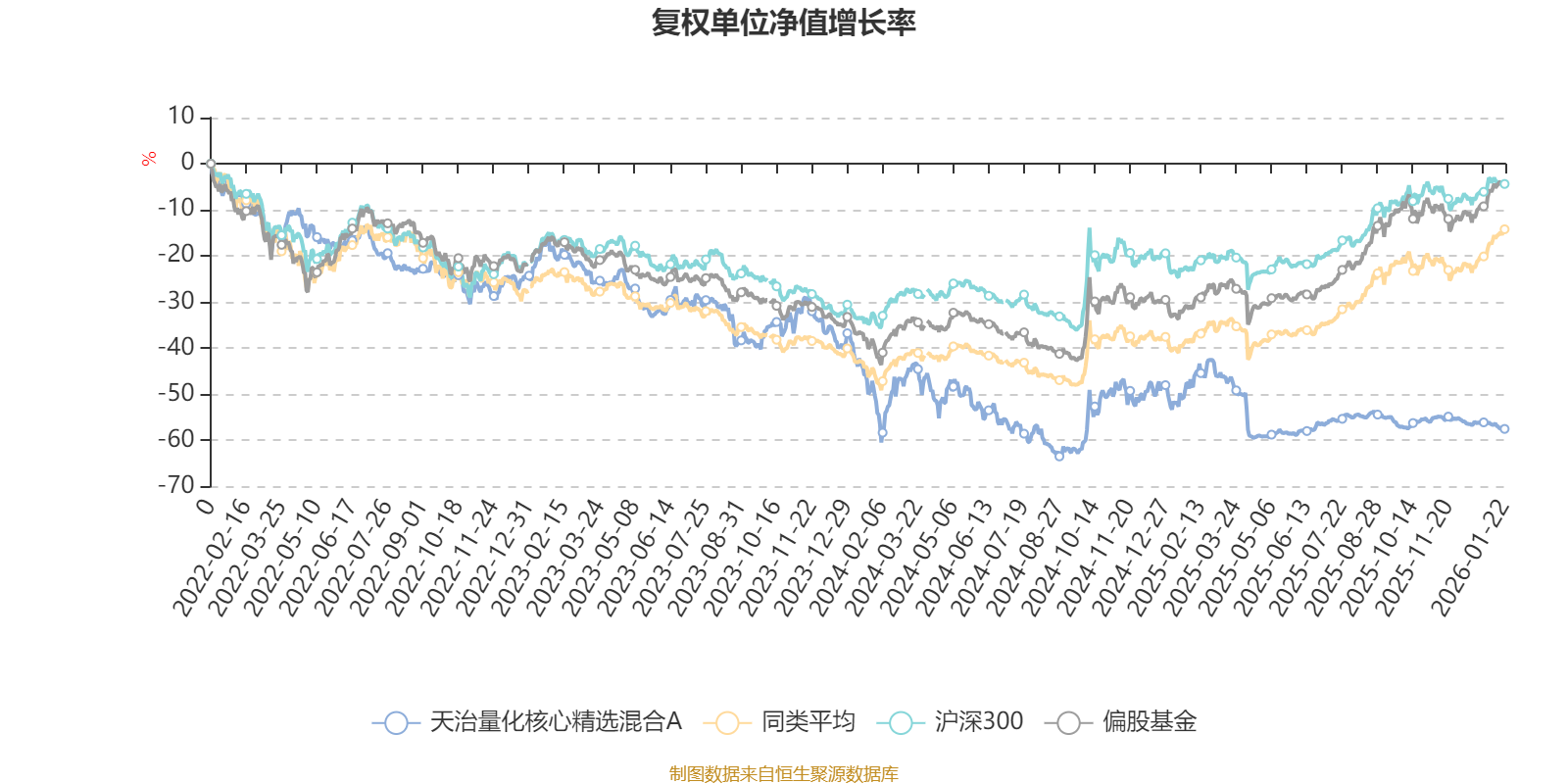 截至1月22日,天治量化核心精选混合A近三个月复权单位净值增长率为-4.19%,位于同类可比基金671/689;近半年复权单位净值增长率为-4.88%,位于同类可比基金682/689;近一年复权单位净值增长率为-18.85%,位于同类可比基金672/673;近三年复权单位净值增长率为-48.56%,位于同类可比基金395/396。