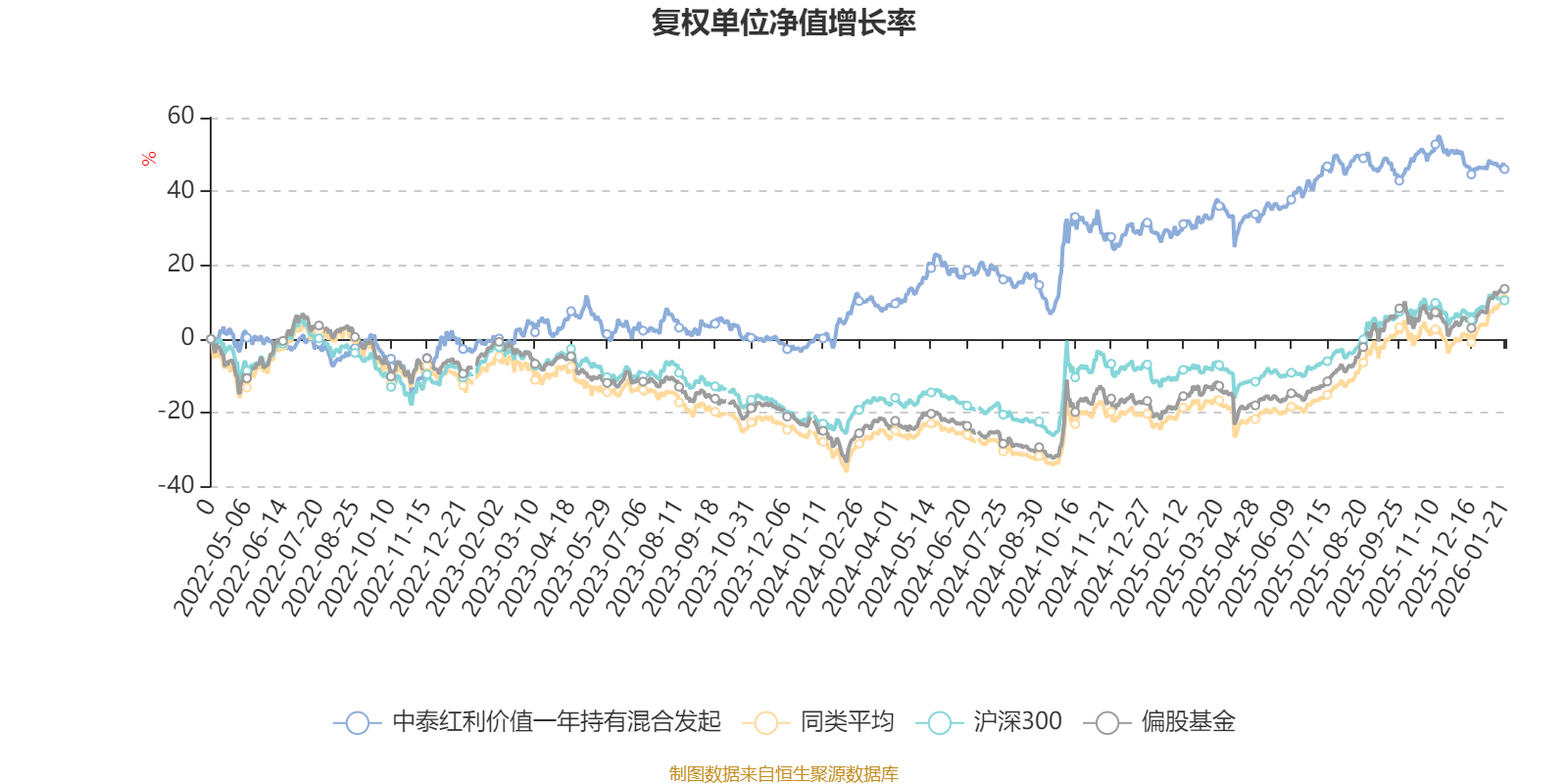 截至1月21日,中泰红利价值一年持有混合发起近三个月复权单位净值增长率为-2.74%,位于同类可比基金262/265;近半年复权单位净值增长率为-1.04%,位于同类可比基金264/265;近一年复权单位净值增长率为13.19%,位于同类可比基金252/265;近三年复权单位净值增长率为44.73%,位于同类可比基金45/256。