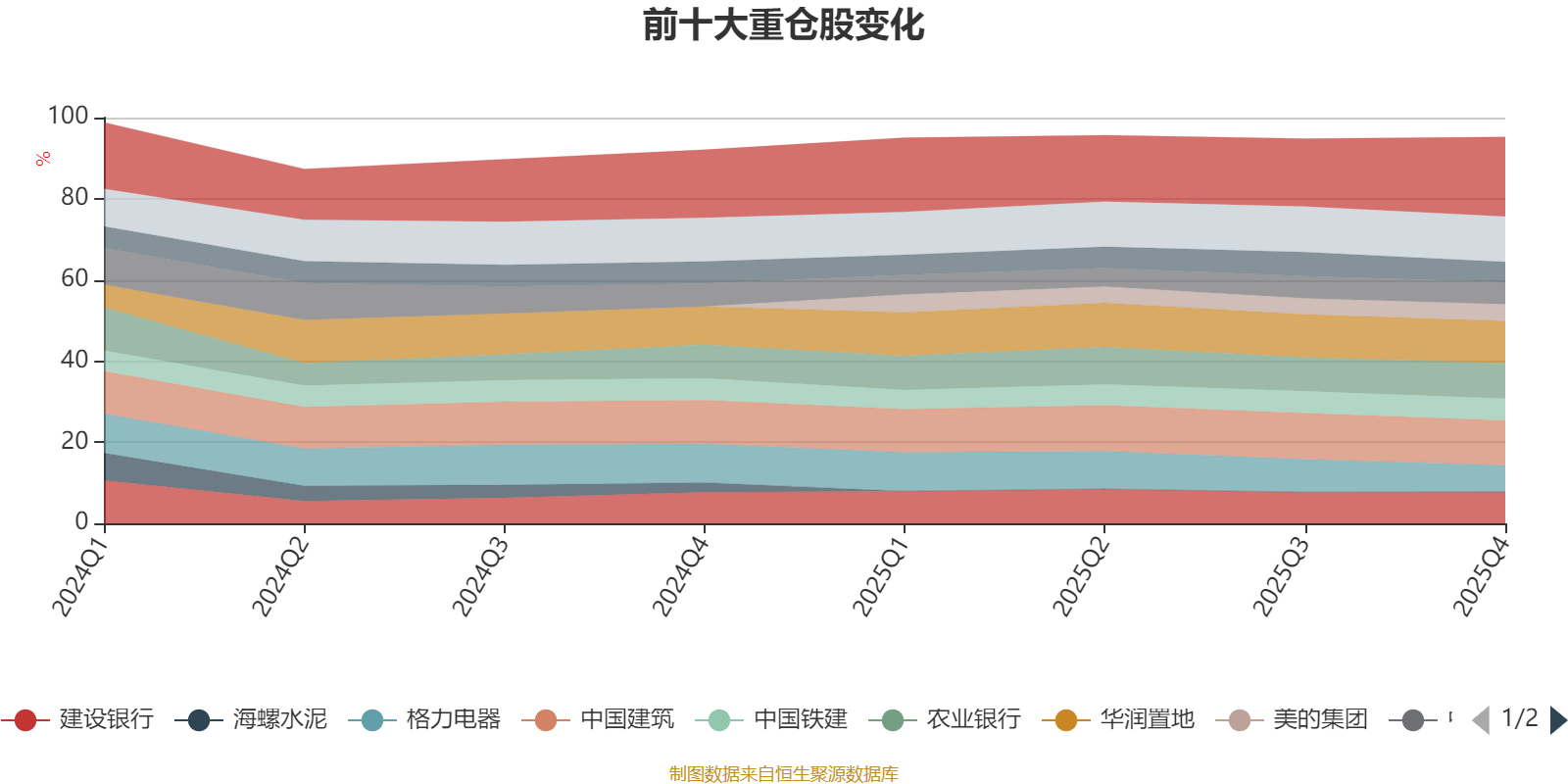 该基金持股集中度较高,且持股标的较为稳定,近2年前十大重仓股集中度长期超过60%。截至2025年四季度末,基金十大重仓股分别是招商银行、中国建筑、华润置地、农业银行、建设银行、格力电器、中国神华、中国铁建、中国中铁、美的集团。
