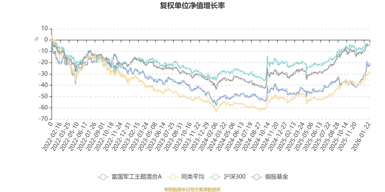 截至1月22日,富国军工主题混合A近三个月复权单位净值增长率为28.34%,位于同类可比基金8/100;近半年复权单位净值增长率为29.87%,位于同类可比基金61/100;近一年复权单位净值增长率为50.01%,位于同类可比基金39/92;近三年复权单位净值增长率为8.28%,位于同类可比基金35/68。