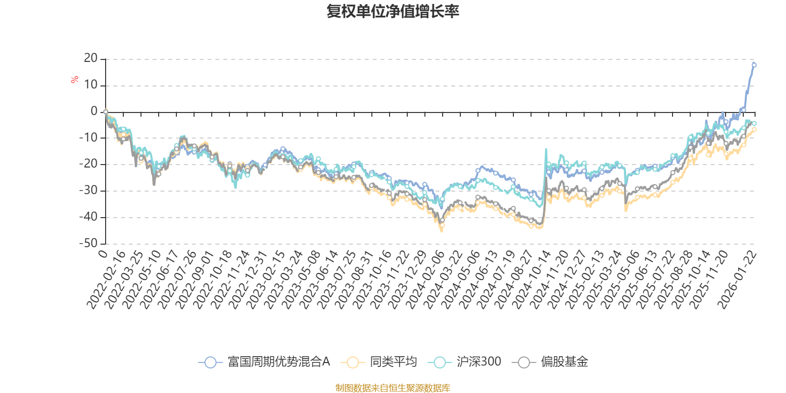 截至1月22日,富国周期优势混合A近三个月复权单位净值增长率为29.41%,位于同类可比基金1/185;近半年复权单位净值增长率为42.34%,位于同类可比基金28/185;近一年复权单位净值增长率为56.07%,位于同类可比基金37/183;近三年复权单位净值增长率为38.42%,位于同类可比基金32/176。