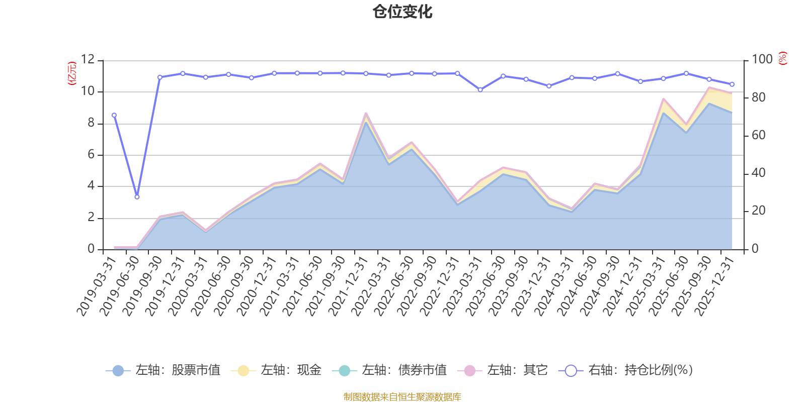 据定期报告数据统计,近三年平均股票仓位为89.69%,同类平均为72.57%。2021年三季度末基金达到93.28%的最高仓位,2019年上半年末最低,为27.79%。