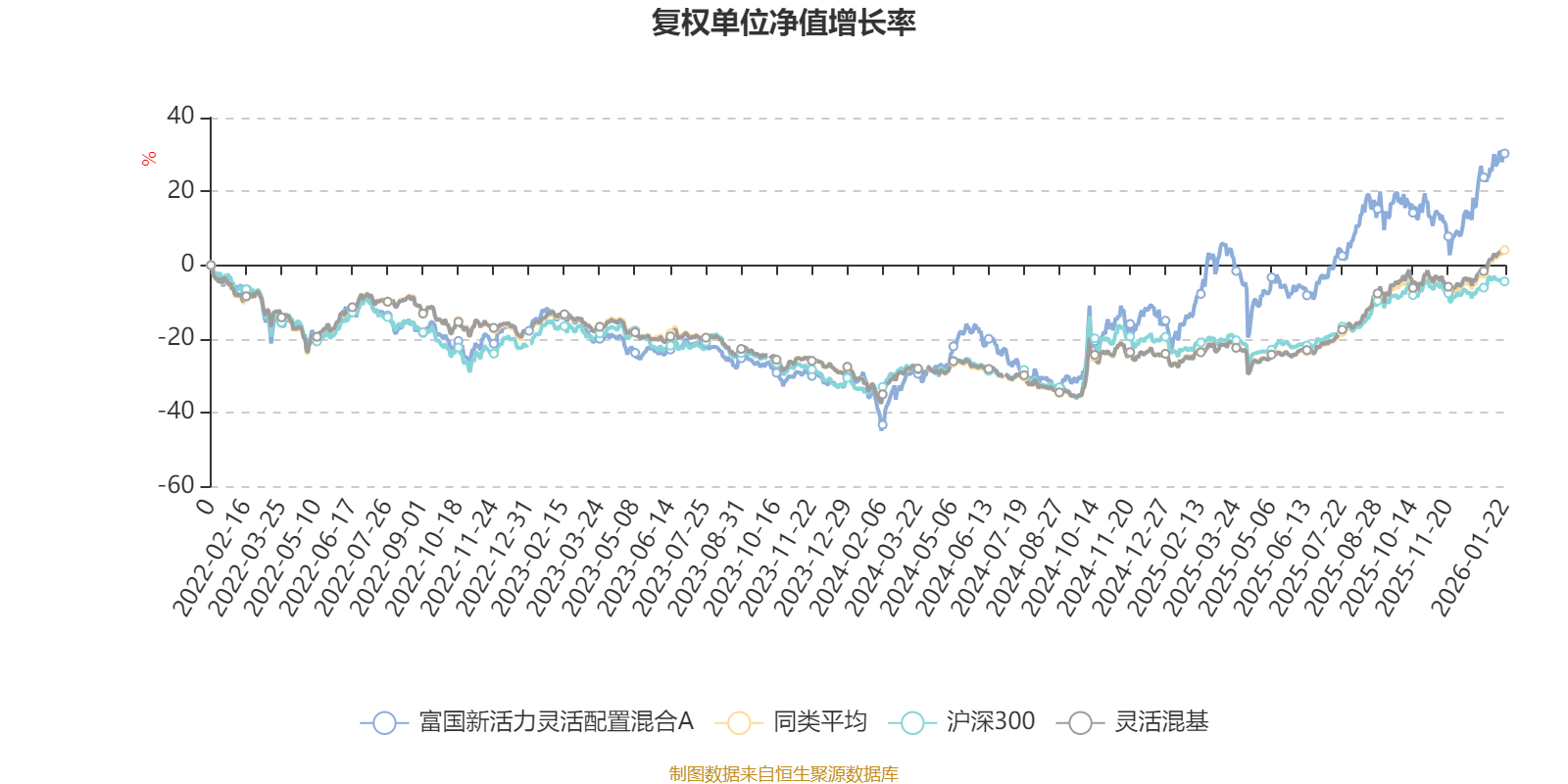 截至1月22日,富国新活力灵活配置混合A近三个月复权单位净值增长率为11.81%,位于同类可比基金453/1286;近半年复权单位净值增长率为27.07%,位于同类可比基金495/1286;近一年复权单位净值增长率为51.59%,位于同类可比基金315/1286;近三年复权单位净值增长率为47.86%,位于同类可比基金200/1286。