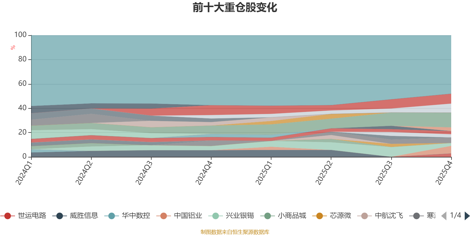 截至2025年四季度末,基金十大重仓股分别是紫金矿业、北方华创、宁德时代、中国铝业、寒武纪、云铝股份、世运电路、东山精密、金诚信、兴业银锡。