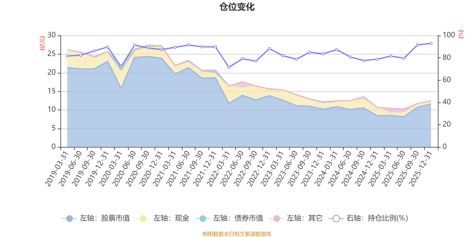 据定期报告数据统计,近三年平均股票仓位为83.32%,同类平均为86.12%。2025年末基金达到92.95%的最高仓位,2022年一季度末最低,为71.51%。