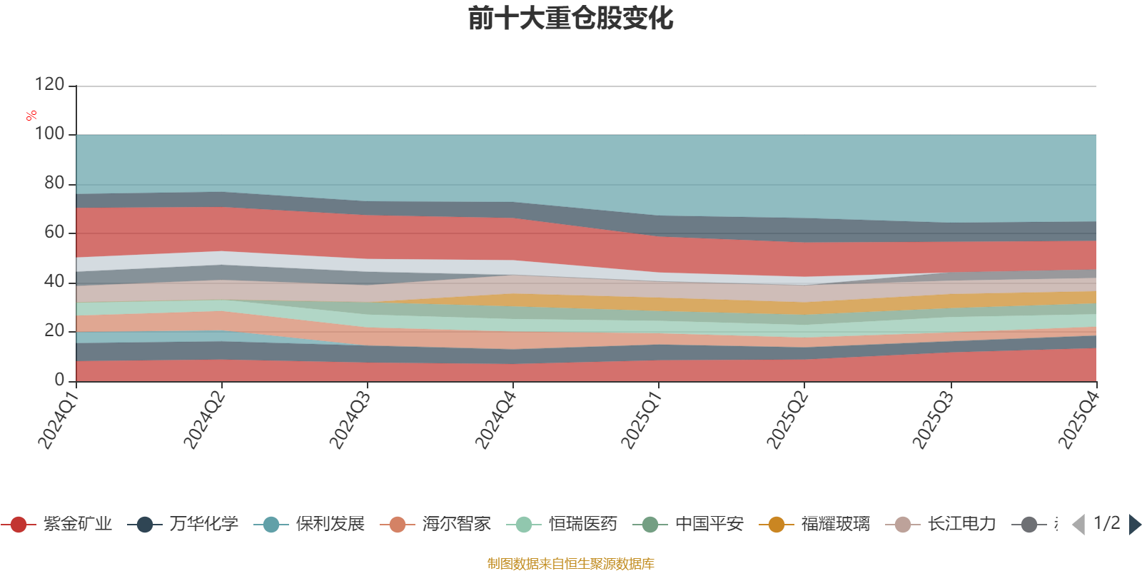 该基金持股集中度较高,且持股标的较为稳定,近2年前十大重仓股集中度长期超过60%。截至2025年四季度末,基金十大重仓股分别是紫金矿业、贵州茅台、招商银行、长江电力、万华化学、恒瑞医药、福耀玻璃、中国平安、海尔智家、赤峰黄金。