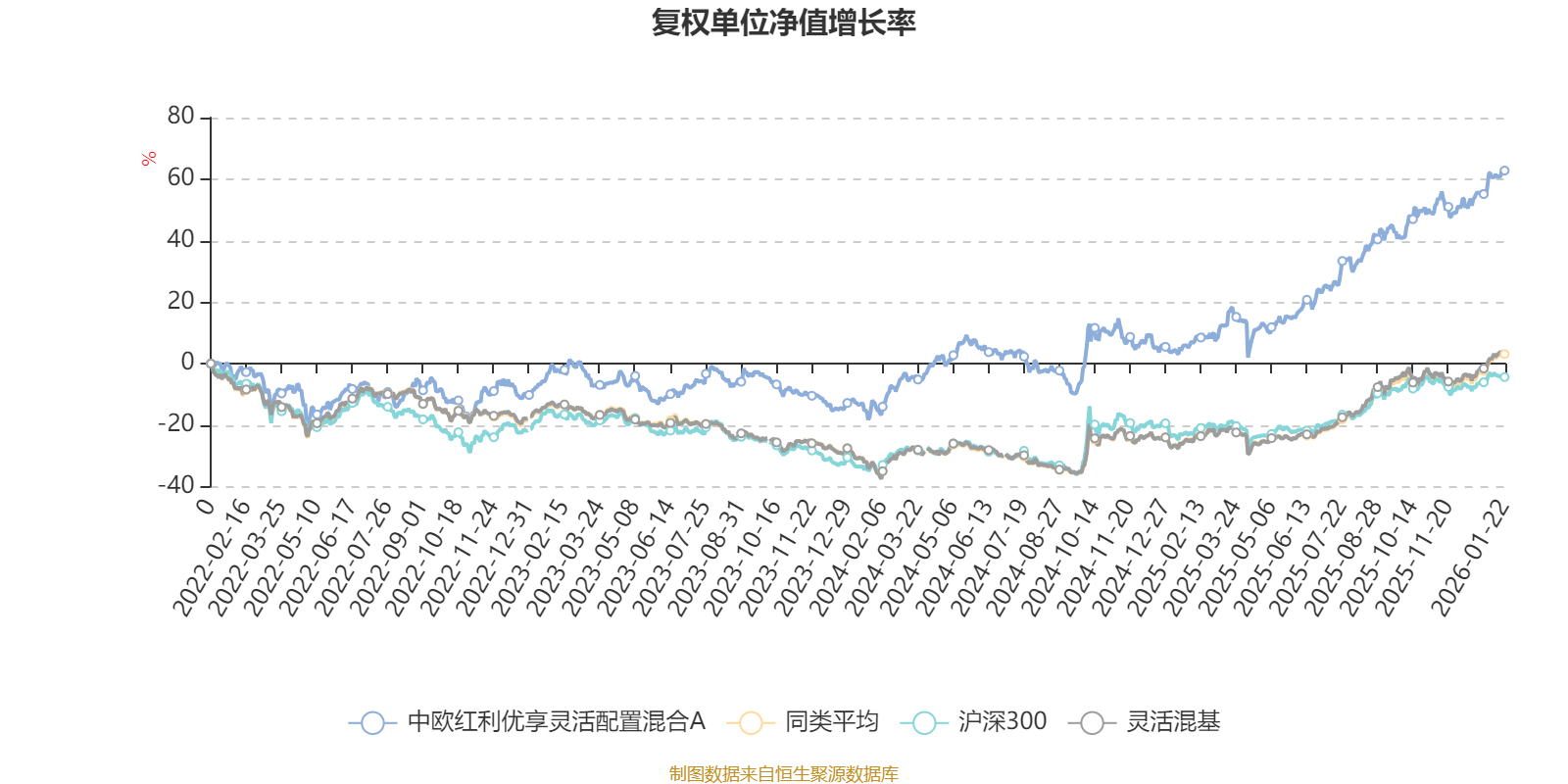 截至1月22日,中欧红利优享灵活配置混合A近三个月复权单位净值增长率为9.05%,位于同类可比基金607/1286;近半年复权单位净值增长率为22.06%,位于同类可比基金625/1286;近一年复权单位净值增长率为54.66%,位于同类可比基金264/1286;近三年复权单位净值增长率为68.17%,位于同类可比基金92/1286。