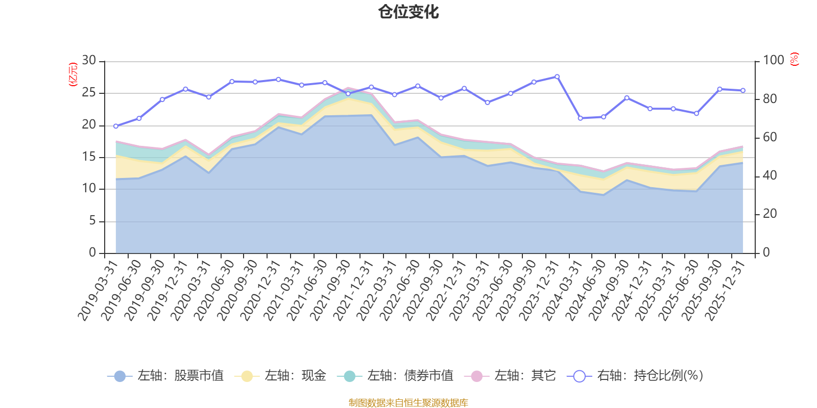 据定期报告数据统计,近三年平均股票仓位为79.89%,同类平均为87.64%。2023年末基金达到91.96%的最高仓位,2019年一季度末最低,为66.17%。