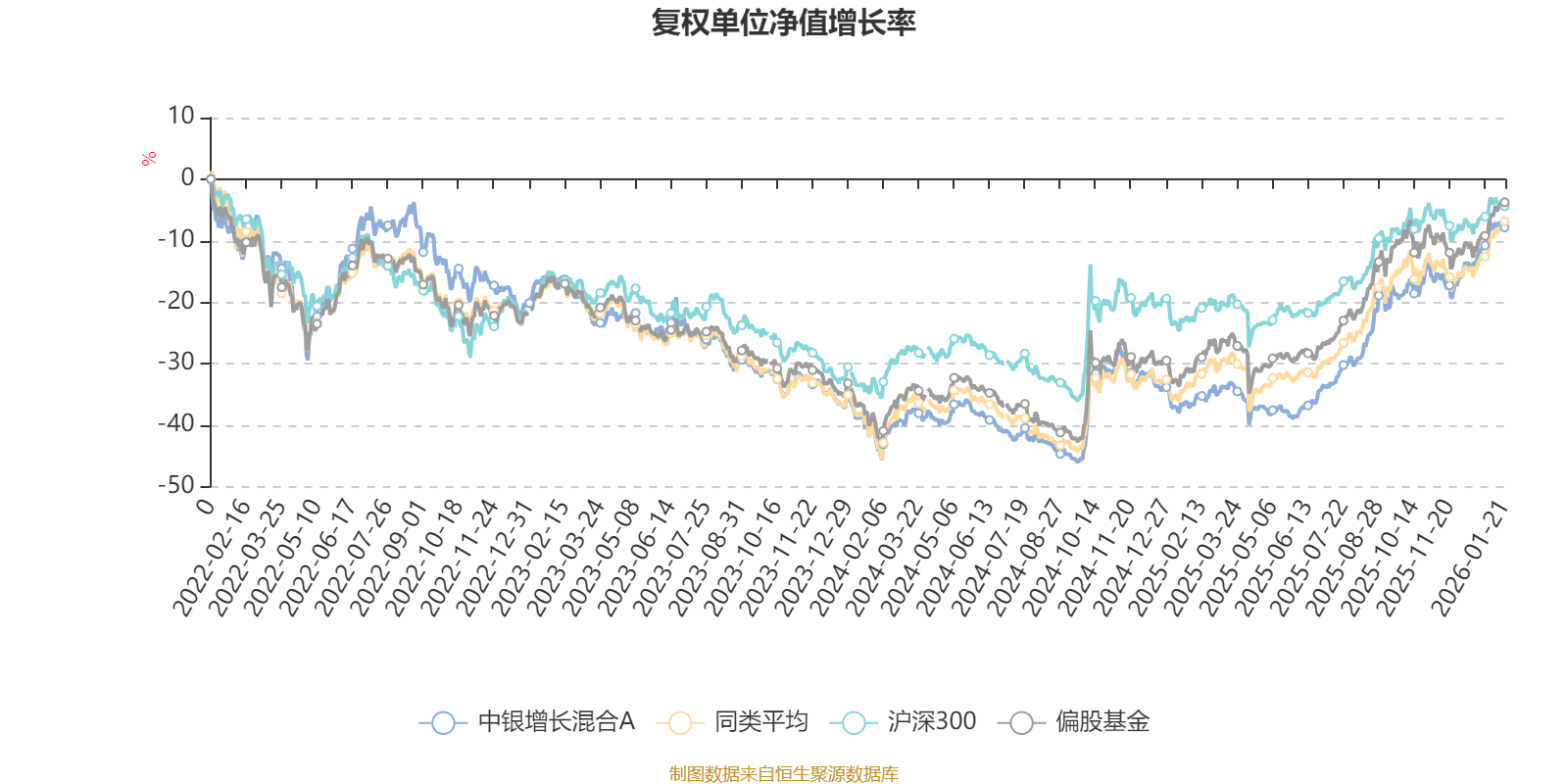 截至1月21日,中银增长混合A近三个月复权单位净值增长率为10.74%,位于同类可比基金67/185;近半年复权单位净值增长率为32.66%,位于同类可比基金50/185;近一年复权单位净值增长率为44.60%,位于同类可比基金76/183;近三年复权单位净值增长率为9.23%,位于同类可比基金110/176。