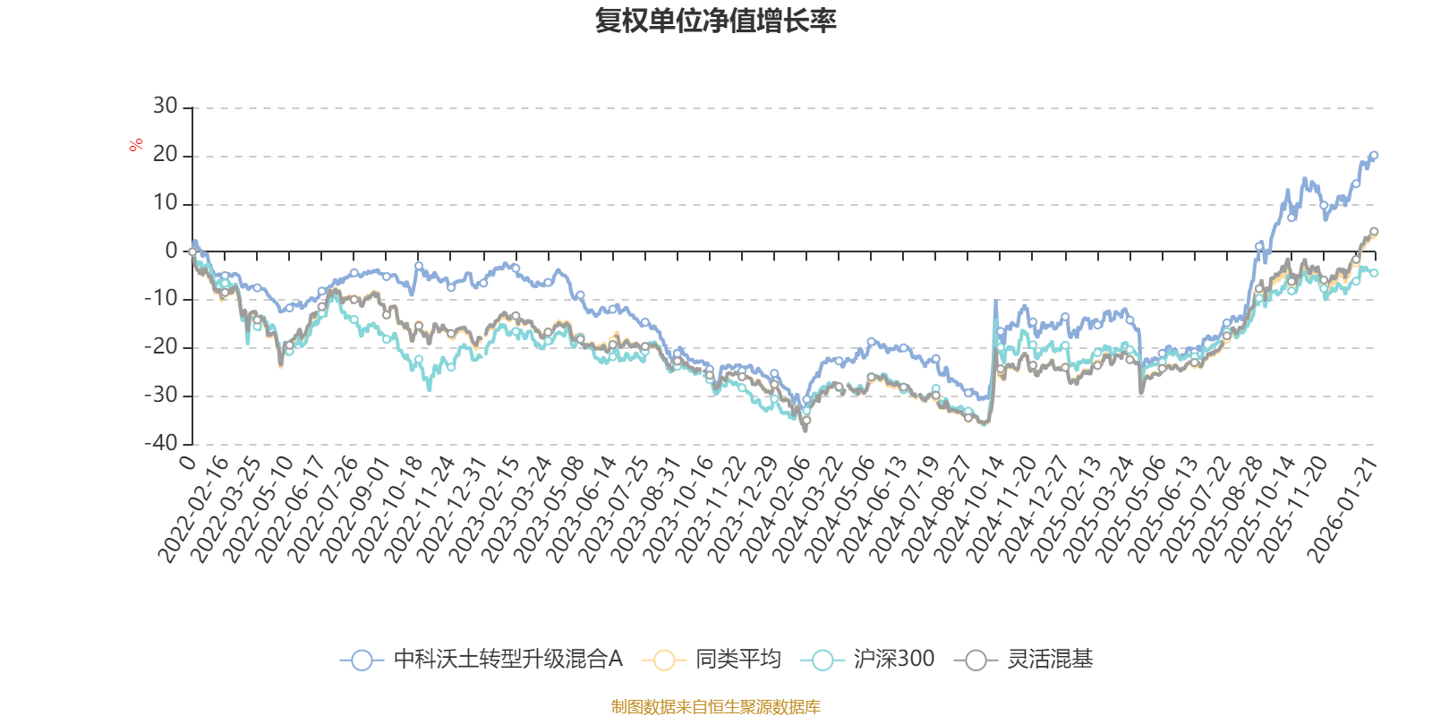 截至1月21日,中科沃土转型升级混合A近三个月复权单位净值增长率为8.96%,位于同类可比基金586/1286;近半年复权单位净值增长率为41.13%,位于同类可比基金250/1286;近一年复权单位净值增长率为39.31%,位于同类可比基金506/1286;近三年复权单位净值增长率为24.09%,位于同类可比基金476/1286。
