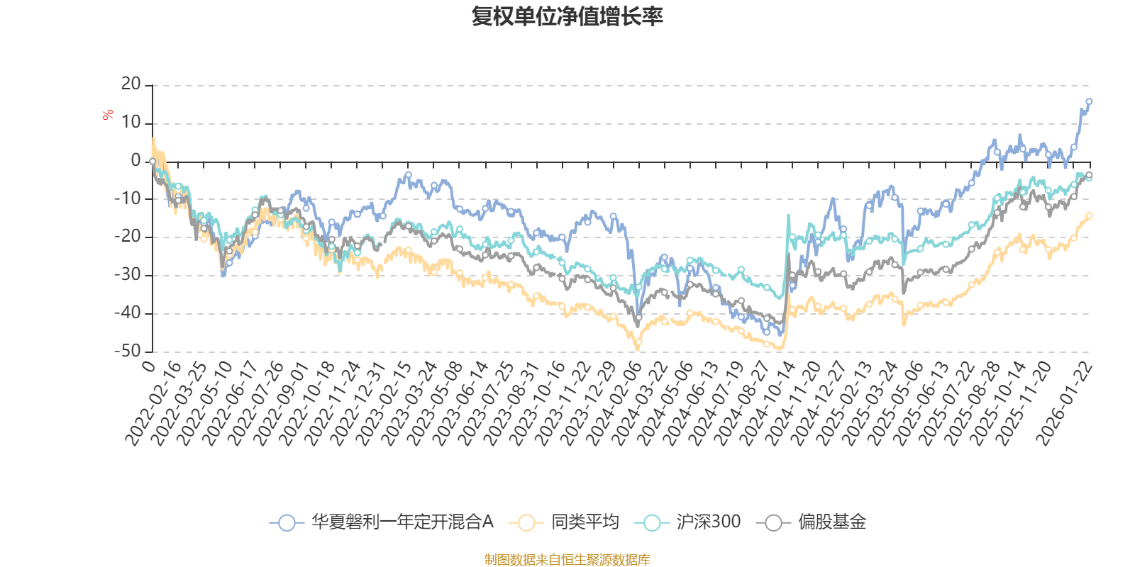 截至1月22日,华夏磐利一年定开混合A近三个月复权单位净值增长率为13.97%,位于同类可比基金138/621;近半年复权单位净值增长率为22.64%,位于同类可比基金350/621;近一年复权单位净值增长率为47.01%,位于同类可比基金220/613;近三年复权单位净值增长率为25.90%,位于同类可比基金196/535。