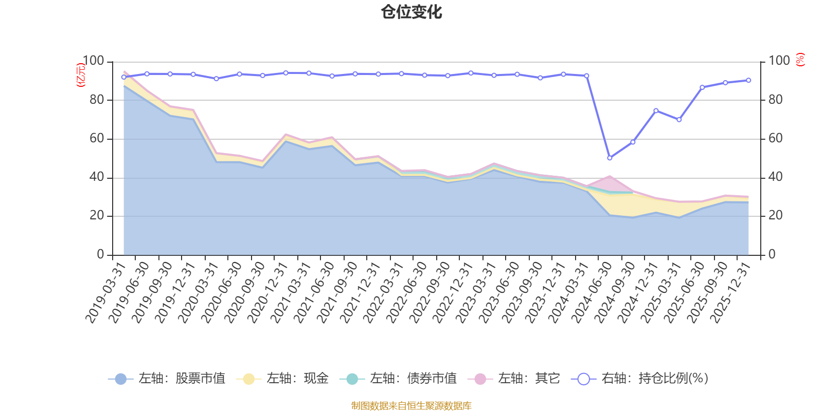 据定期报告数据统计,近三年平均股票仓位为81.99%,同类平均为72.57%。2020年末基金达到94.19%的最高仓位,2024年上半年末最低,为50.25%。