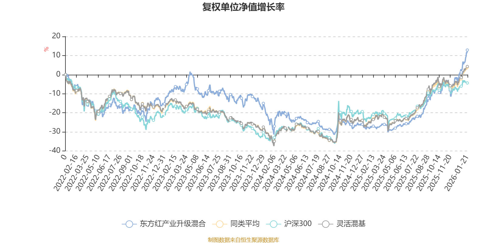 截至1月21日,东方红产业升级混合近三个月复权单位净值增长率为22.16%,位于同类可比基金96/1286;近半年复权单位净值增长率为44.59%,位于同类可比基金204/1286;近一年复权单位净值增长率为56.70%,位于同类可比基金242/1286;近三年复权单位净值增长率为23.60%,位于同类可比基金485/1286。