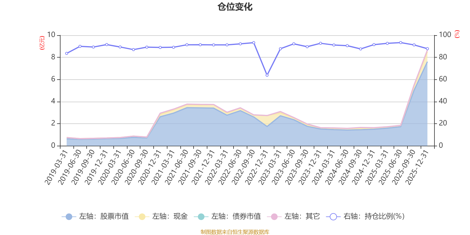 据定期报告数据统计,近三年平均股票仓位为90.71%,同类平均为72.57%。2025年上半年末基金达到93.36%的最高仓位,2022年末最低,为63.86%。