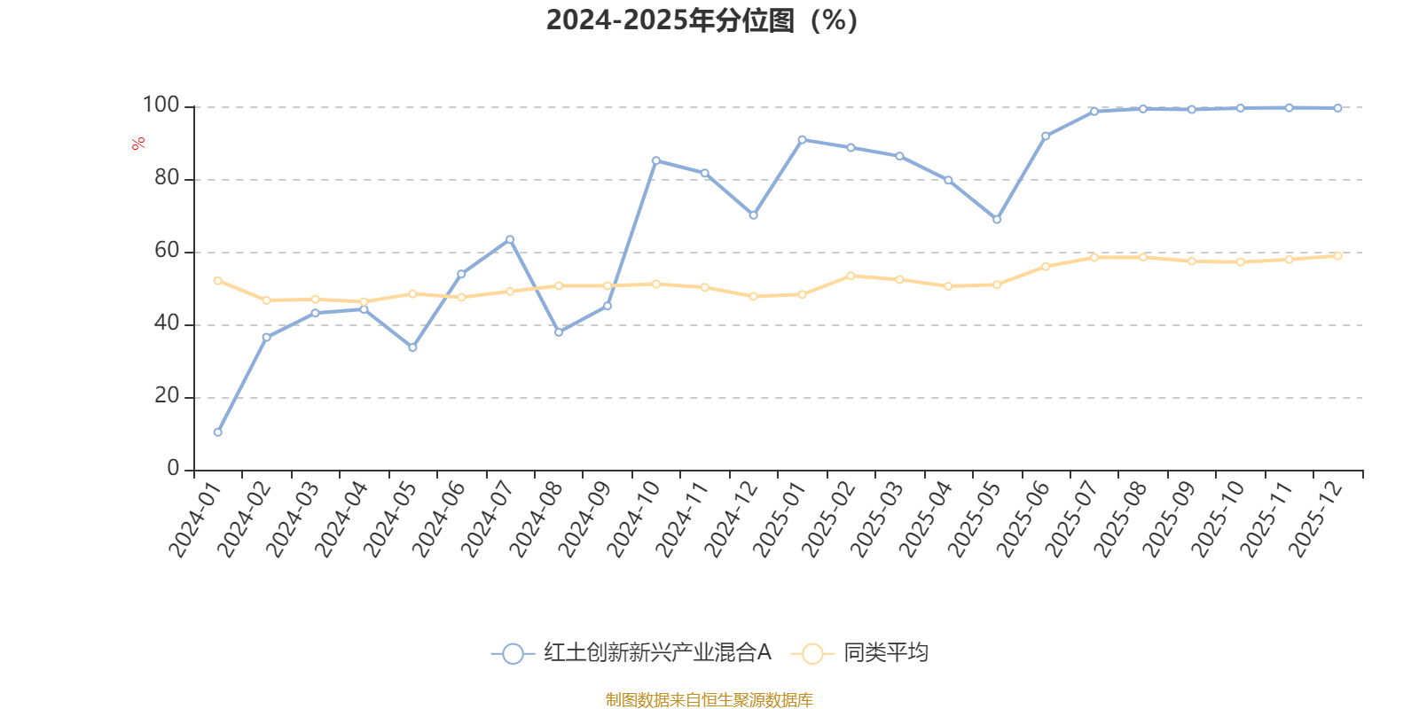 通过所选区间该基金净值增长率分位图,可以观察该基金与同类基金业绩比较情况。图为坐标原点到区间内某时点的净值增长率在同类基金中的分位数。