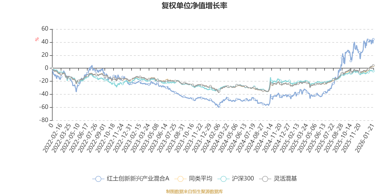 截至1月21日,红土创新新兴产业混合A近三个月复权单位净值增长率为15.50%,位于同类可比基金223/1286;近半年复权单位净值增长率为87.36%,位于同类可比基金3/1286;近一年复权单位净值增长率为134.16%,位于同类可比基金3/1286;近三年复权单位净值增长率为86.37%,位于同类可比基金46/1286。