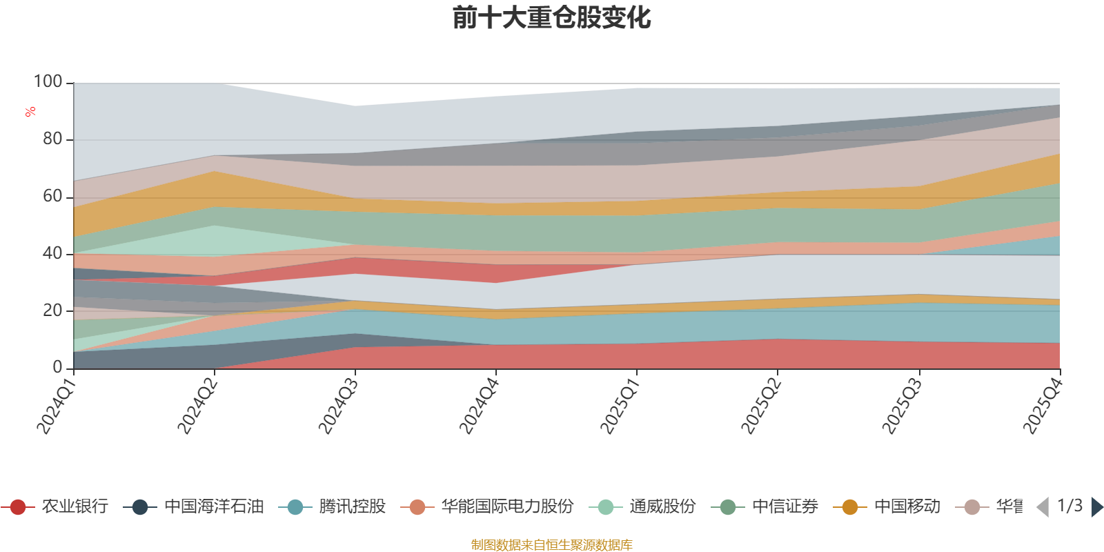 该基金持股集中度较高,近2年前十大重仓股集中度长期超过60%。截至2025年四季度末,基金十大重仓股分别是工商银行、腾讯控股、美的集团、宁德时代、紫金矿业、农业银行、海康威视、中国海油、阿里巴巴-W、中国移动。