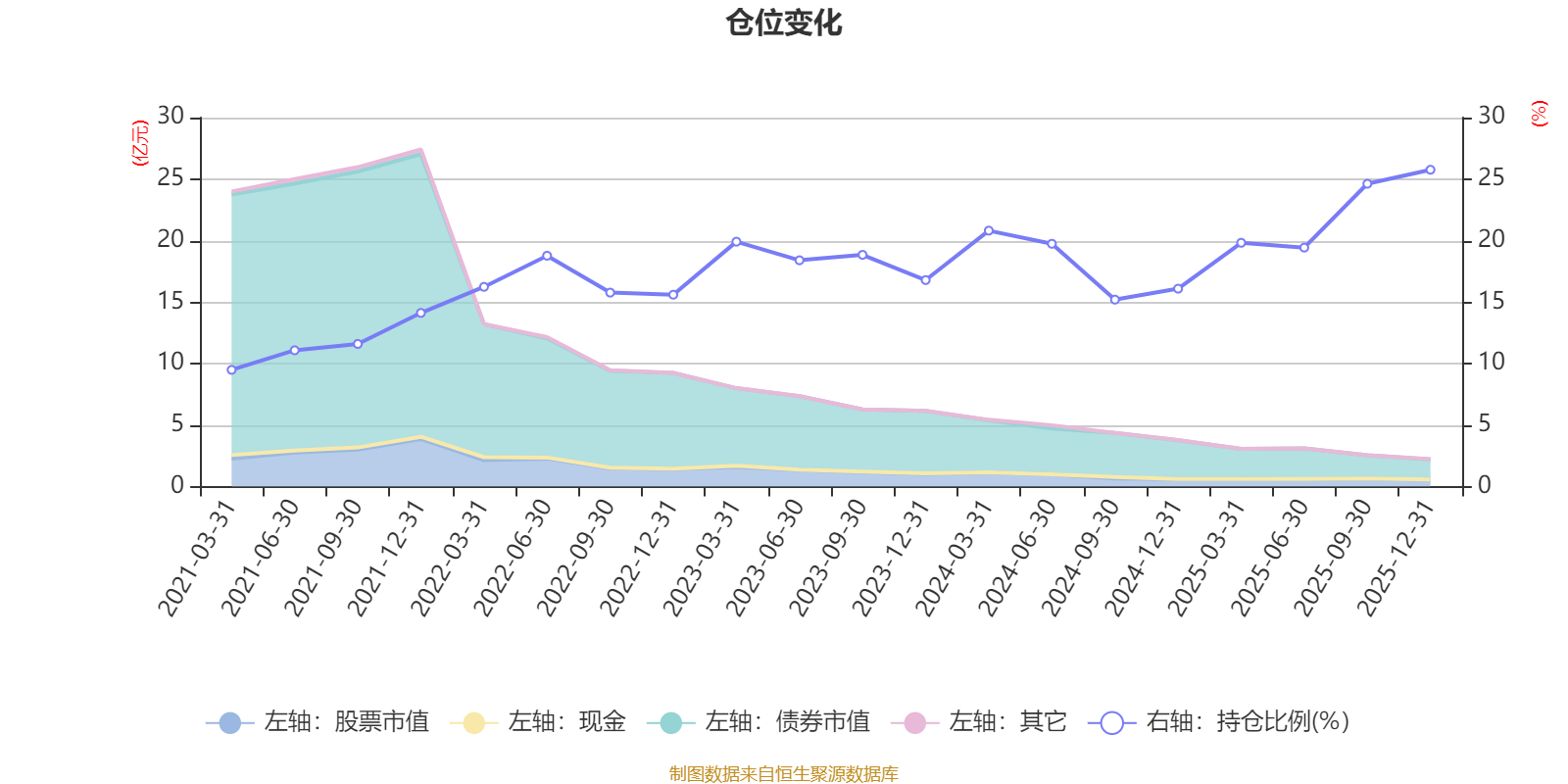 据定期报告数据统计,近三年平均股票仓位为19.62%,同类平均为19.2%。2025年末基金达到25.76%的最高仓位,2021年一季度末最低,为9.49%。