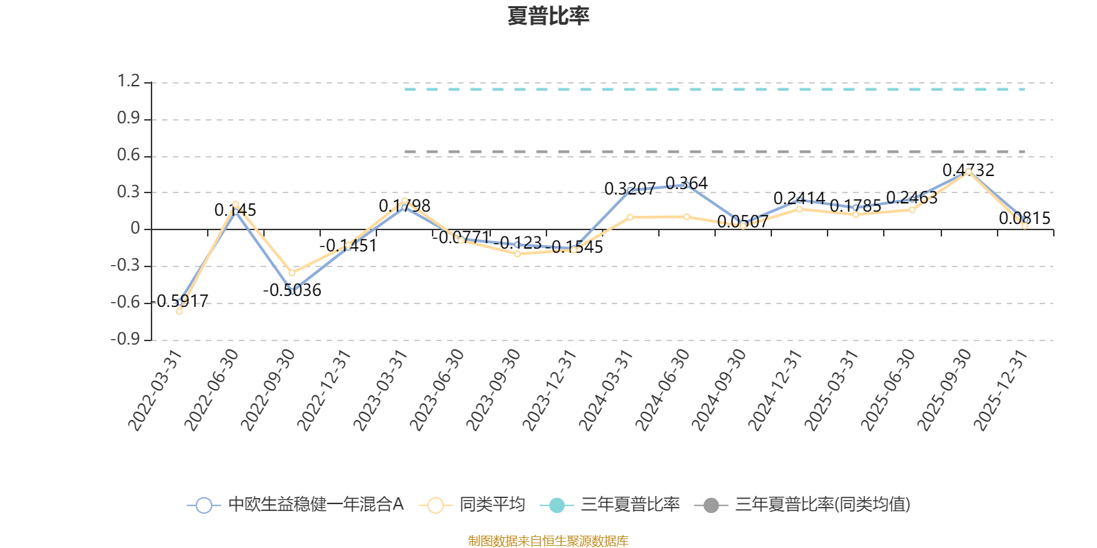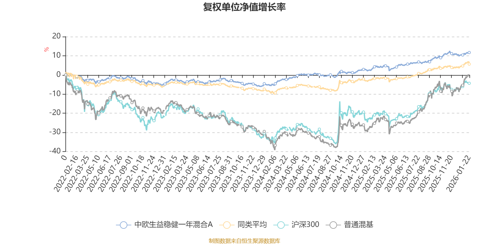 截至1月22日,中欧生益稳健一年混合A近三个月复权单位净值增长率为1.59%,位于同类可比基金411/629;近半年复权单位净值增长率为4.61%,位于同类可比基金284/629;近一年复权单位净值增长率为9.18%,位于同类可比基金244/626;近三年复权单位净值增长率为14.57%,位于同类可比基金192/564。