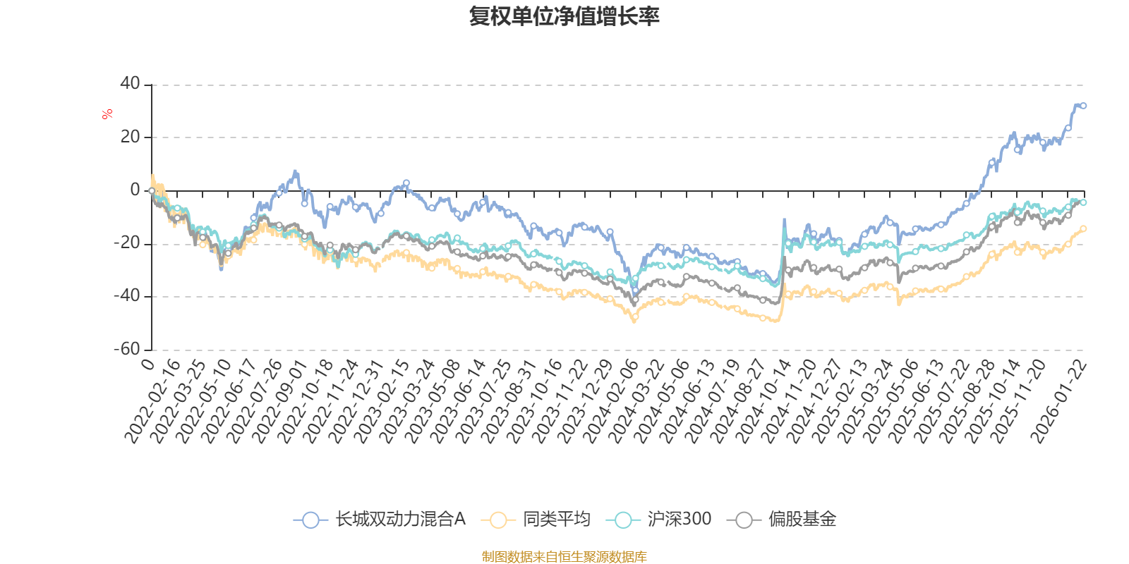截至1月22日,长城双动力混合A近三个月复权单位净值增长率为12.91%,位于同类可比基金170/621;近半年复权单位净值增长率为38.67%,位于同类可比基金133/621;近一年复权单位净值增长率为65.31%,位于同类可比基金76/613;近三年复权单位净值增长率为31.33%,位于同类可比基金160/535。