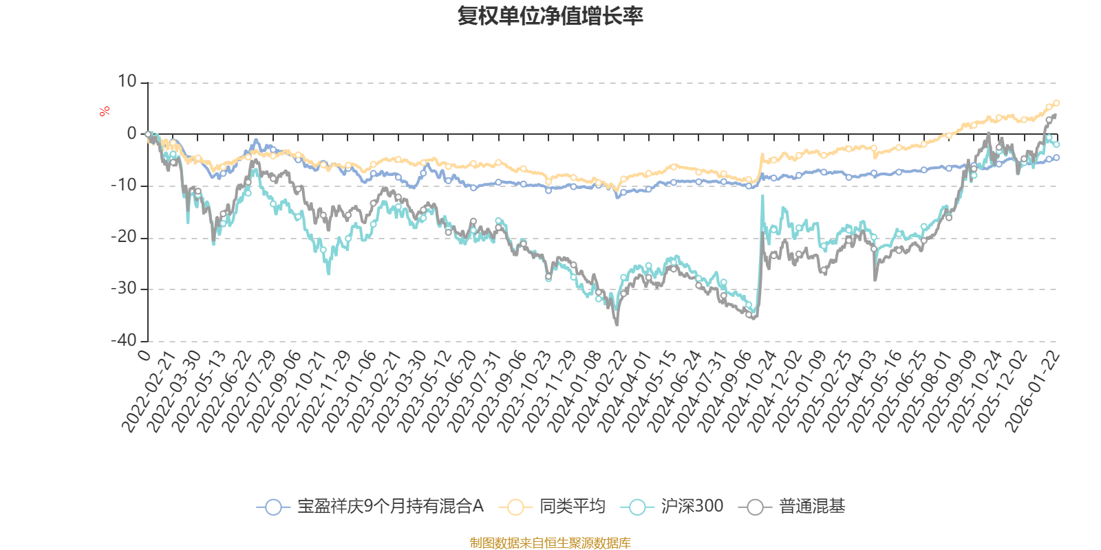 截至1月22日,宝盈祥庆9个月持有混合A近三个月复权单位净值增长率为1.50%,位于同类可比基金421/629;近半年复权单位净值增长率为1.73%,位于同类可比基金538/629;近一年复权单位净值增长率为3.33%,位于同类可比基金560/626;近三年复权单位净值增长率为3.02%,位于同类可比基金502/564。